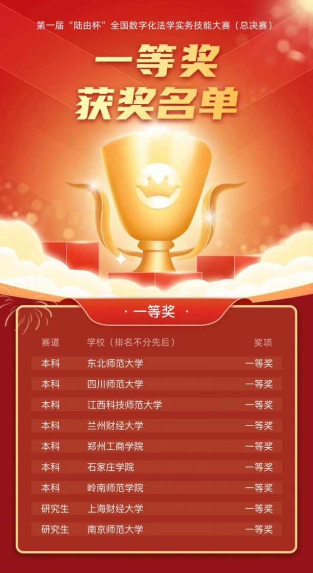 11月24日,第一届“陆由杯”全国数字化法学实务技能大赛总决赛在上海财经大学国定路校区圆满落幕,我校15VIP太阳集团马文、刘志娟两位博士指导的“法智先锋”团队脱颖而出,荣获一等奖。