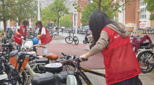 随着时间的推移,随意倚靠、扎堆停放、占道停放、半入车位的车辆均停入规定区域。电动车摆放地整整齐齐,不仅让校园更加美观,也为同学们的出行带来便利。在这场细雨中,志愿者们用行动诠释了何为奉献,何为友爱,同时,也向同学们展示着文明的新风貌。