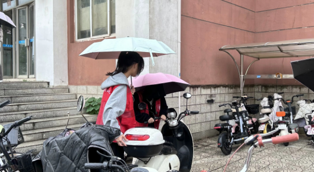 活动过程中,志愿者们被分为4个小组,分别于寝室楼下对乱停乱放的车辆进行规整。尽管天空飘着蒙蒙细雨,但志愿者们的热情丝毫不减:他们合理规划自行车、电动车停放区域;他们分工明确,有条不紊地将一辆辆随意停放的电动车转移到指定区域内,确保道路畅通无阻;他们互相撑伞,干燥的伞面下是一片爱与关怀的天地。