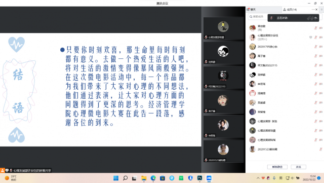 在经济管理学院和同学们的共同努力下,此次心理微电影大赛取得圆满成功。相信同学们通过这次活动能够清楚地认识到生活中的烦恼和一些心理问题,及时地调节情绪,带着韧性、包容、纯真去迎接大学生活,以更加积极阳光的态度投身到大学学习和社会生活中,无论遇到什么困难都要勇敢面对,要学会珍惜拥有,珍爱现在,拥抱精彩。