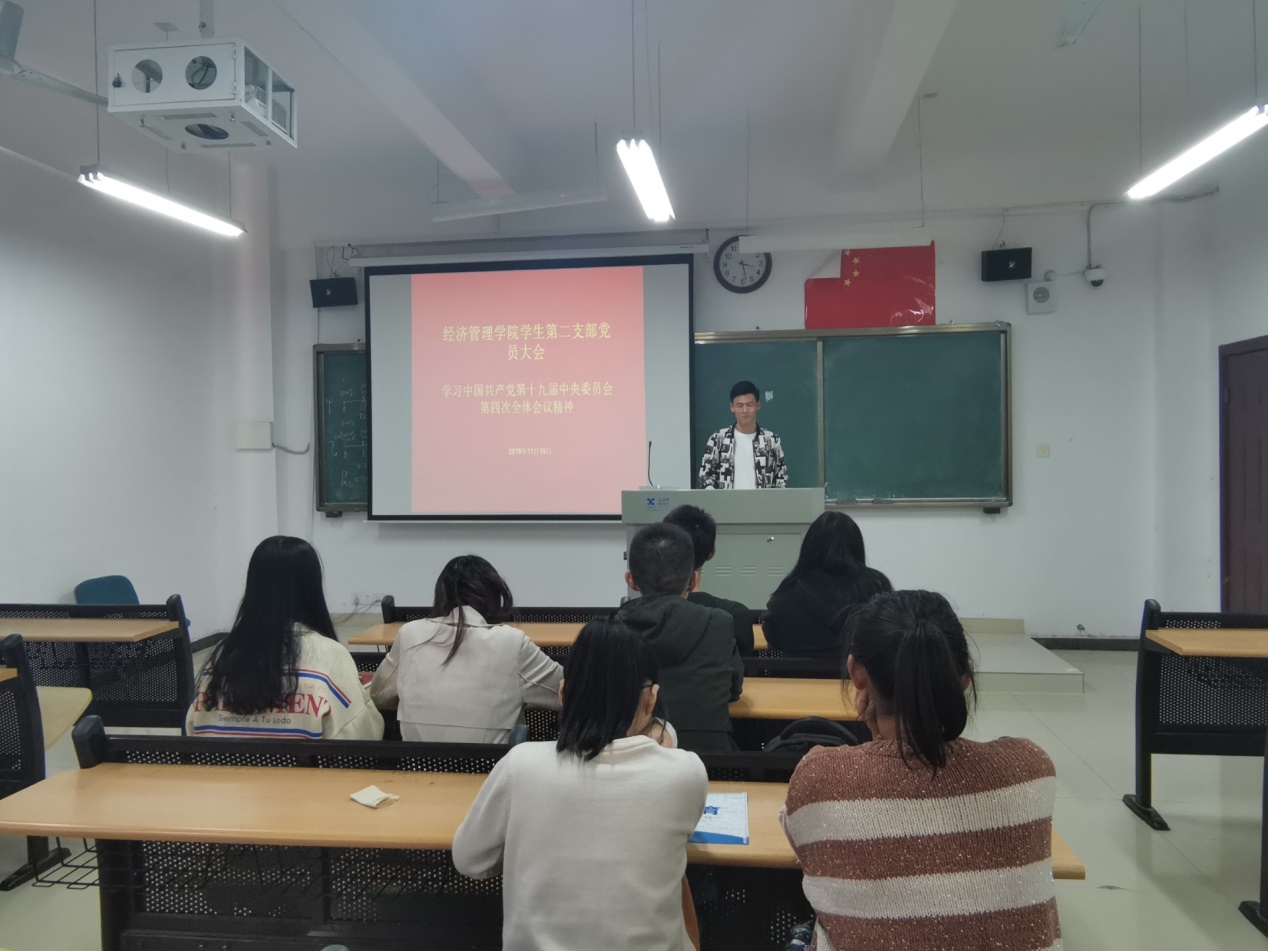 为了进一步推进“不忘初心、牢记使命”主题教育,11月14日下午经济管理学院学生第二党支部在逸夫楼Y411召开了党员全体大会,学习传达党的十九届四中全会精神。