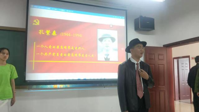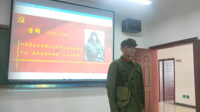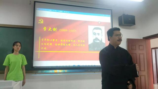 党课中,首先表演了学生党员自演节目《奋斗》(指导老师:曾伟),学生分别扮演李大钊、方志敏、雷锋、孔繁森“来到”了现场,通过角色扮演与朗诵结合的形式,再现了历史,,演员铿锵有力的声音振奋人心,激发出党课成员们内心的共鸣。
