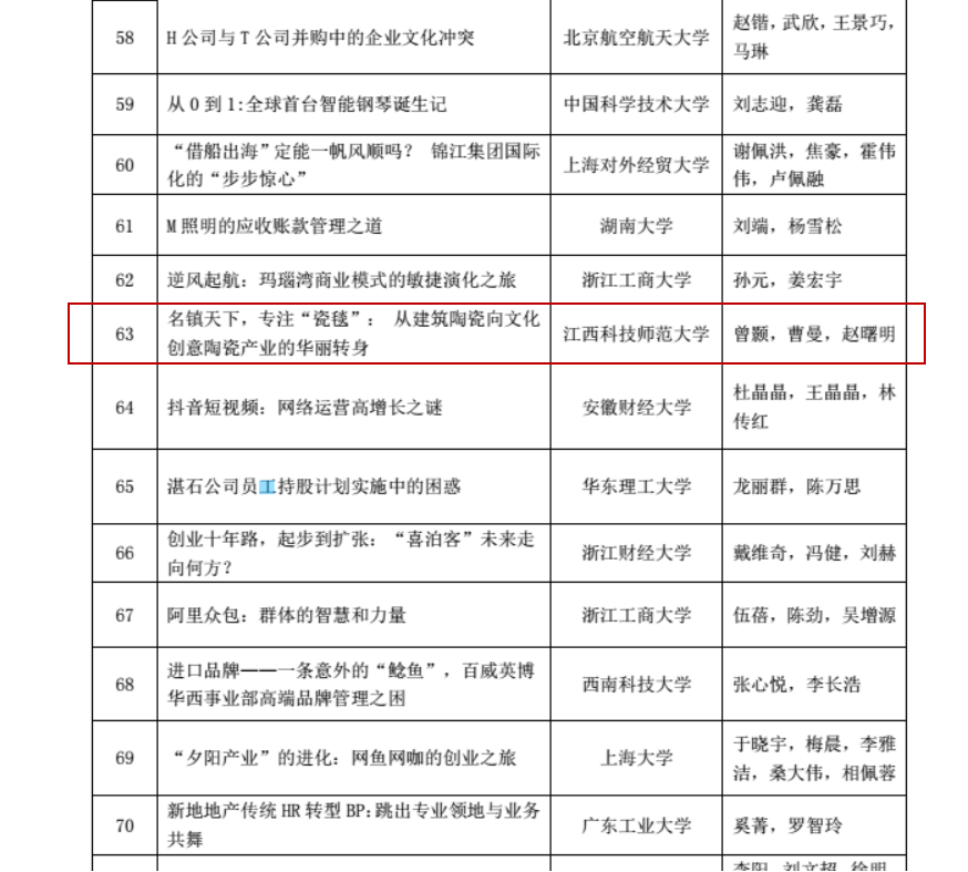 近日,由全国工商管理专业学位研究生教育指导委员会举办、中国管理案例共享中心承办的第九届“全国百篇优秀管理案例”公布评选结果。来自全国122所院校的842篇案例参评,经两轮专家评审,45所院校的92篇案例入选全国百优、15所院校的20篇案例入选全国微案例、11所院校的15篇案例入选全国西部专项、5篇案例入选全国重点项目。我校经济管理学院教师曾颢主持开发的原创性管理案例《名镇天下,专注“瓷毯”:从建筑陶瓷向文化创意陶瓷产业的华丽转身》成功入选。这是我校首次获得“全国百篇优秀管理案例”的殊荣,也成为该奖项设立以来第三所有案例成果入选的省内高校,充分体现了我校在管理案例开发与研究中所做的不懈努力与取得的重大突破。