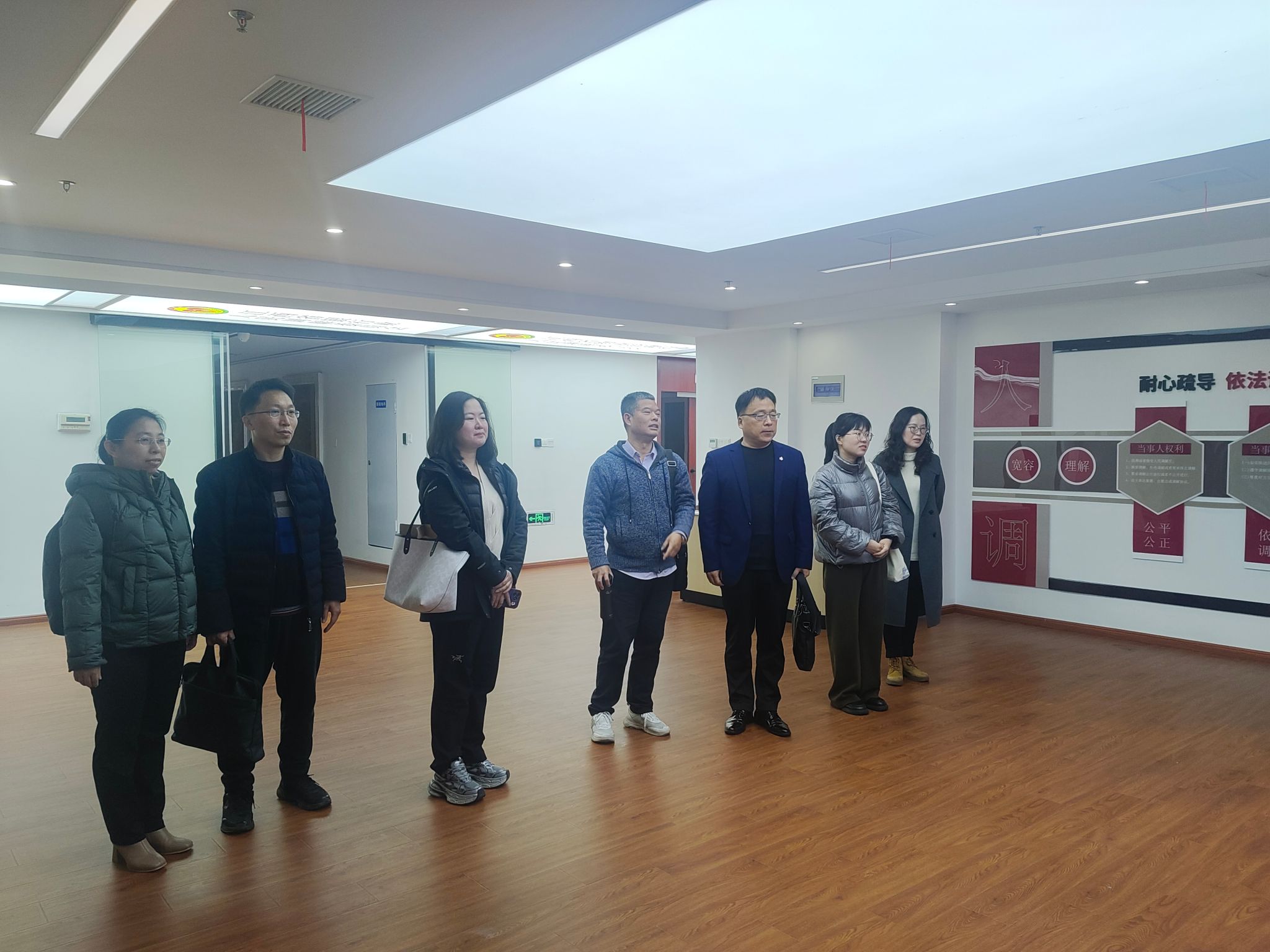 座谈结束后,罗时贵邀请王仰文一行参观了我院校外法治人才教育实训培养基地。该基地是我院法学专业打造“产教学研”一体化创新模式的综合型法治服务基地。王仰文对此高度赞赏,认为“产教学研”一体化的人才培养模式是对新文科背景下法学专业建设发展的有益探索,具有良好的发展前景和未来。