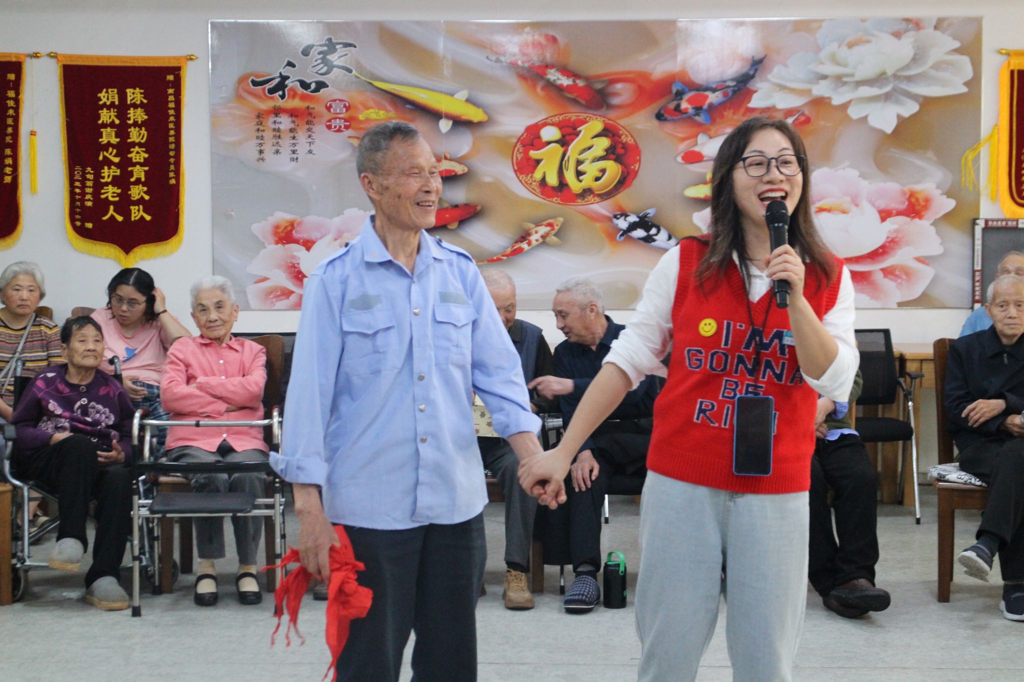 霞光映照桑榆晚,温情化露润心田。我院志愿者们走进老人房间,陪他们聊天谈心。志愿者们还共同歌唱歌曲《学习雷锋好榜样》《我和你》,现场气氛热烈。散文《绿》的深情朗诵,用声音传递了文字的温度。趣味的魔术和游戏互动让老人们笑声不断,将活动气氛推向高潮。活动最后,志愿者们与老人们合影,记录下美好的瞬间。