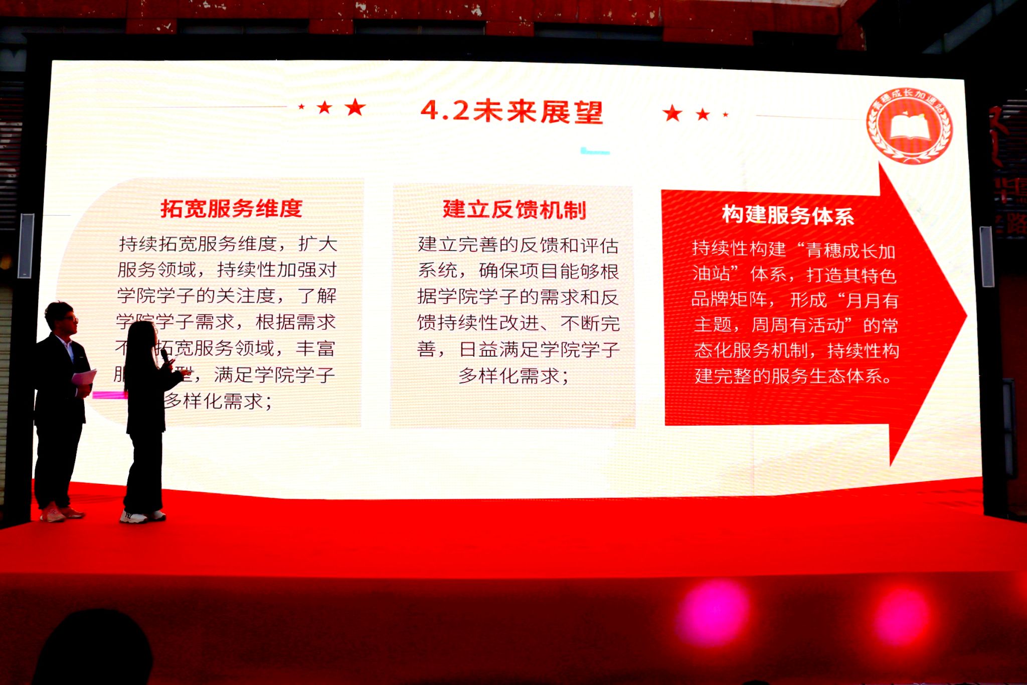 在路演环节,学生代表首先详细阐述了“青穗成长加速站”品牌项目的建设理念,随后重点介绍了其核心内容。作为我院重点打造的特色服务项目,“青穗成长加速站”充分发挥学院学科优势,构建起“学业—就业—法律”三位一体的综合服务体系,为同学们提供了涵盖学业支持、就业指导与法律服务等多方面的专业支持。