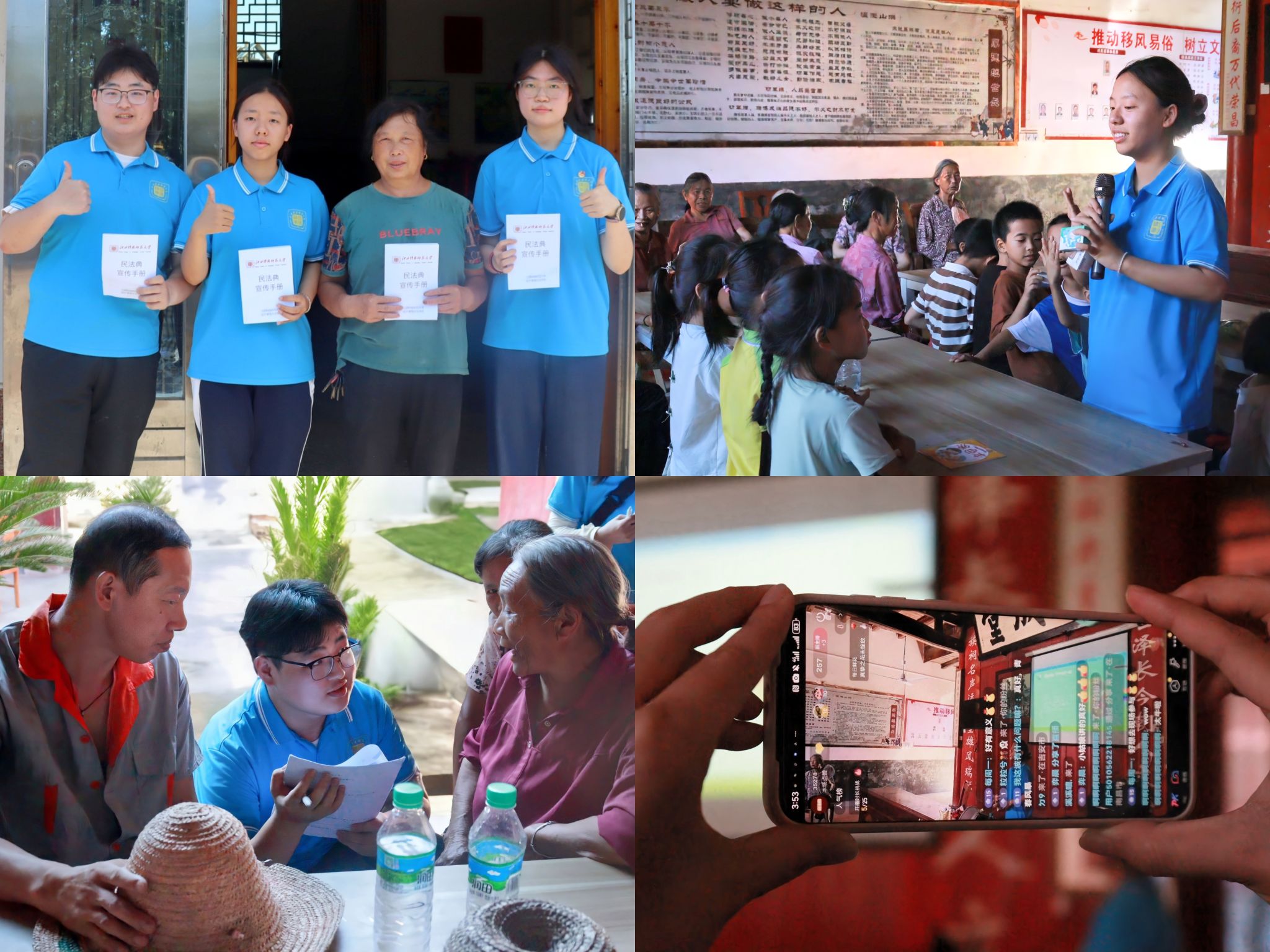 乡村振兴,产业复兴,经济的发展离不开一脉相承的文化基因,更离不开基层治理。7月5日,实践队深入高陂镇开展“送法下乡”系列活动,队员们走访十余户村民,发放《民法典》手册;结合案例为村民解读《民法典》并答疑解惑,针对儿童群体还特别设计了“对错大考验”游戏,通过PPT列举“被欺负该找谁”等趣味问答,普及《未成年人保护法》。同时,实践队还借助新媒体平台开展线上法律直播,吸引2000余人次观看,收获点赞逾3.5万次。