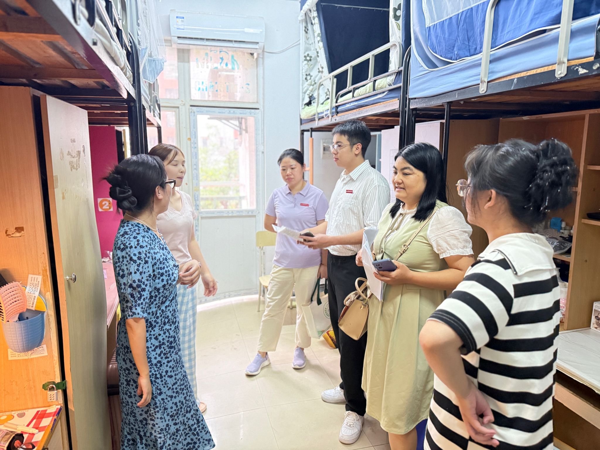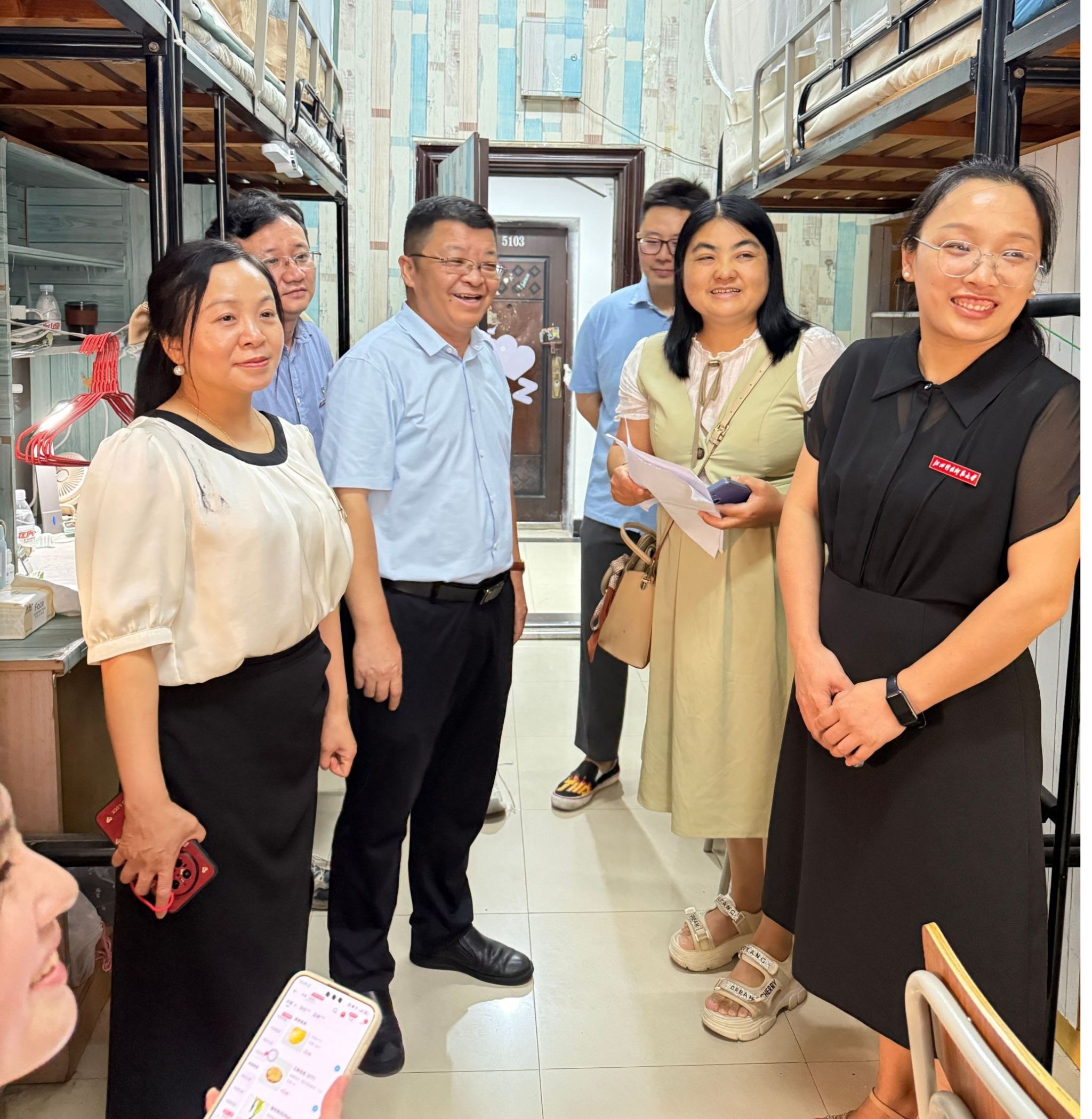 傍晚六点,为深入了解新生的入住体验和适应状况,我院黎明书记等领导与辅导员一同走进学生寝室,与刚刚入住的同学们进行亲切交谈。这一过程中,学院领导细心询问了同学们报到流程是否顺畅、饮食住宿的适应情况,以及对大学课程设置的初步感受。面对部分新生初入校园的陌生与拘谨,学院领导则是主动拉近距离,结合自身经历分享大学生活规划经验,鼓励大家尽快调整心态,主动融入集体,积极参与校园活动。