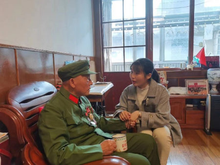 易晋凡既是受访者,也是一位正在努力学习做访谈的采访者。2021年4月,她寻访抗美援朝老兵舒信树,聆听老一辈在抗美援朝战场上入党初心故事,制作的两辈人时空对话的视频被学习强国刊登,共青团江西省委员会官方微博宣传报道。
