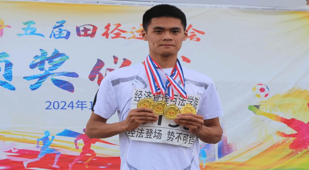 “各就位——预备!”发令枪响的瞬间,他如离弦之箭冲出起跑线。2024年校运会上,他接连以10.90秒、22.76秒包揽男子100米、200米冠军,更带领学院4×100米以及4×400米接力队以巨大优势夺冠并且100米成绩与校纪录持平。当四枚金牌同时挂上脖颈时,看台上爆发的欢呼声里,夹杂着解说员的惊叹:“非体育专业学生持平校史纪录,这是属于拼搏者的奇迹!