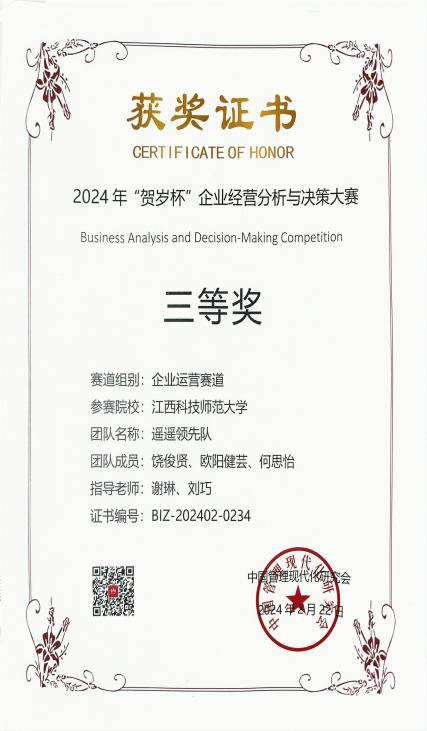 在省级比赛中,饶俊贤同样屡创佳绩。他荣获第十四届全国大学生电子商务“创新、创意及创业”省级银奖、第九届江西省“互联网+”大学生创新创业大赛省级铜奖、第十届江西省高校企业竞争模拟大赛二等奖等多项荣誉。特别是在2024年“权➕福”项目中,他和他的团队荣获中国国际大学生创新大赛省赛铜奖,并且成功获得省级立项,展现了他在创新创业领域的独特眼光和领导才能。
