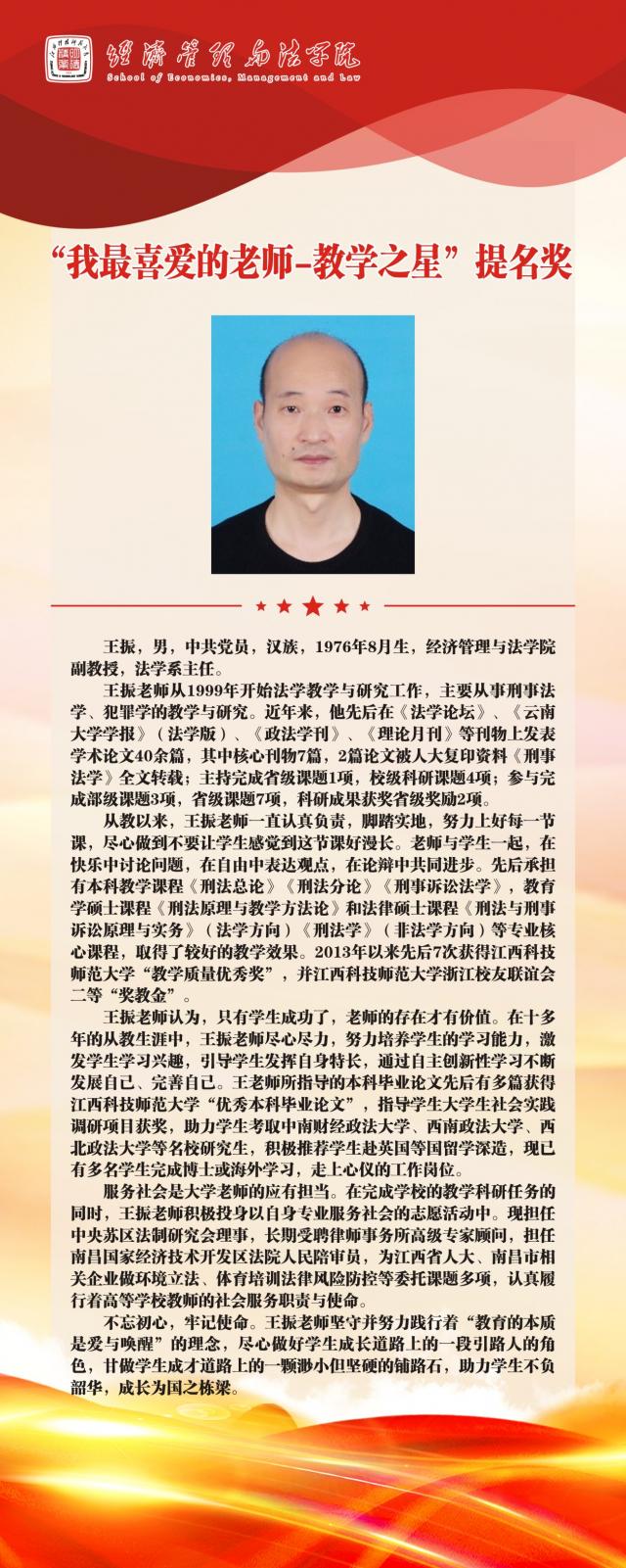 【教师风采】2024年度校“我最喜爱的老师-教学之星”提名奖-王振