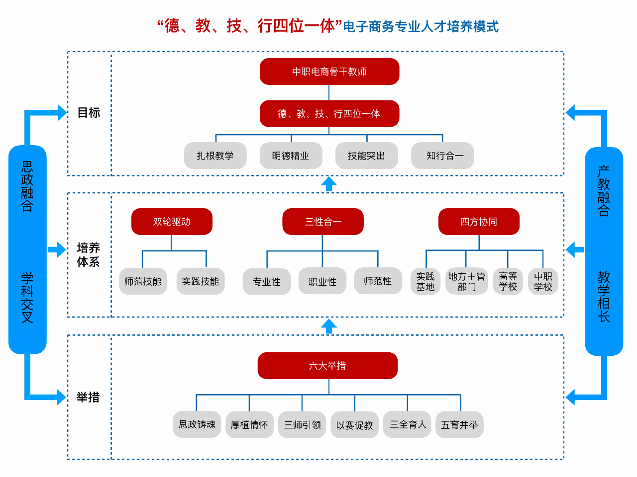产教赛共舞,师范育匠心。电子商务专业围绕培养“懂技术、会管理、强教学”的“双师型”职教师资培养目标,通过“技术+管理+教学”三维路径提升职教师资职业性、师范性、专业性“三性融合”。建立校企校“三导师制”,通过校内外导师共上一堂课、共备一份案,实习论文指导双线并进等方式,提升职教师范生的职业教育教学能力和职业技能实践能力。