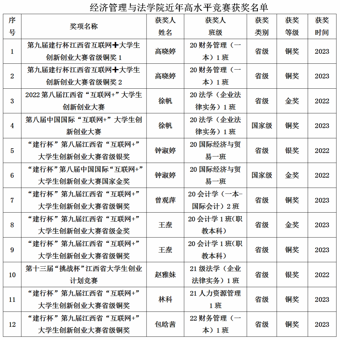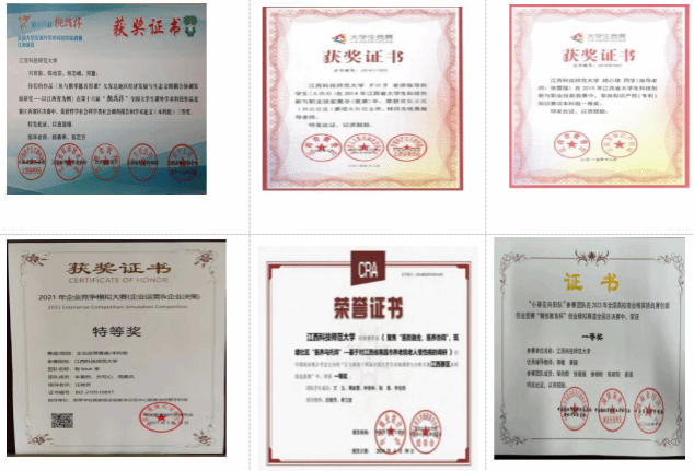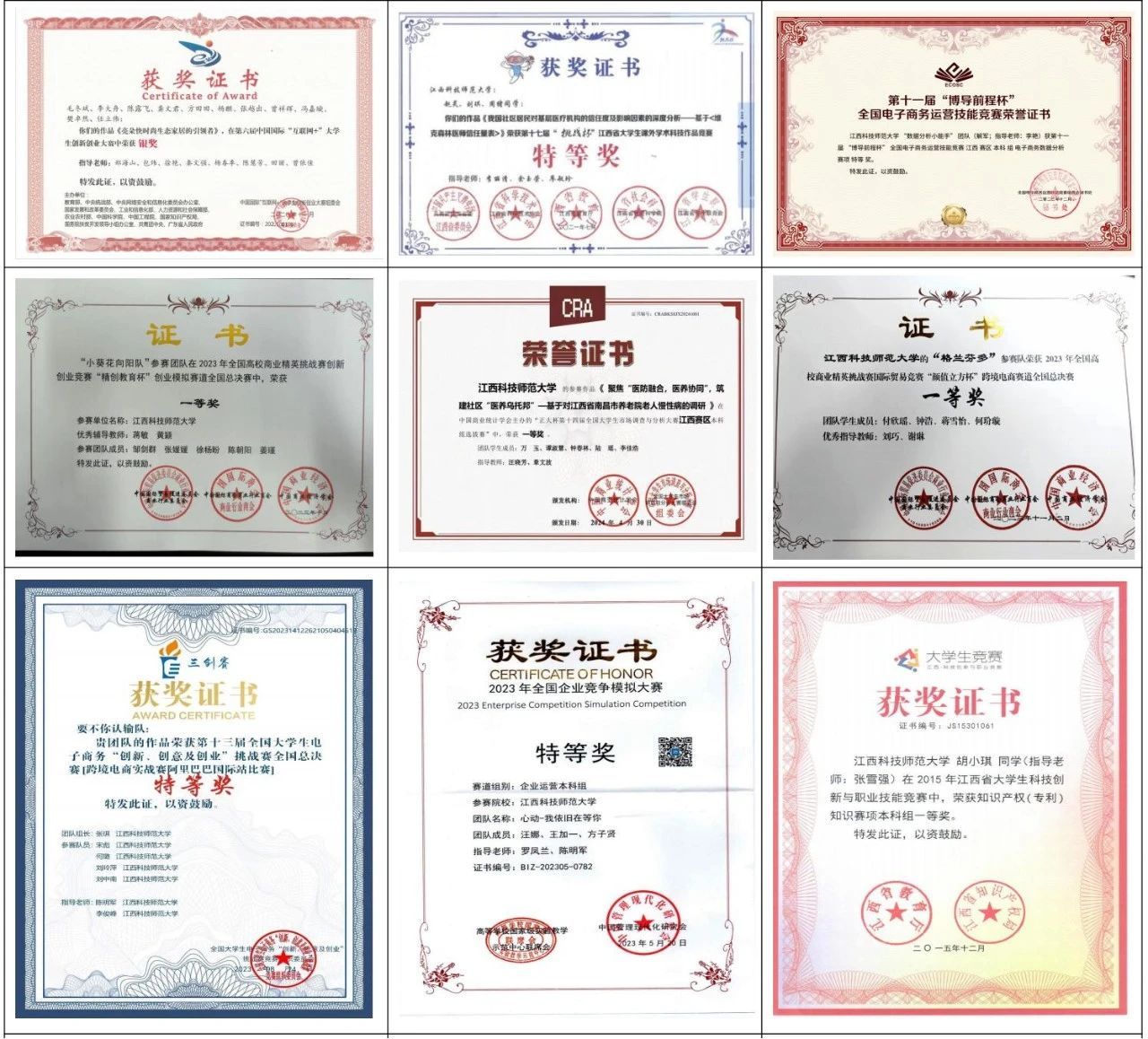 近年来,学生获中国国际“互联网+”大学生创新创业大赛国家金奖、银奖;全国挑战杯大赛江西省特等奖、一等奖;全国大学生电子商务“创意、创新、创业”挑战赛第一名、特等奖;获得中国职业技术师范院校教学技能大赛等各类竞赛奖1200余项。学院与江西亮朵实业公司合作,电子商务专业学生在2020年中国国际“互联网+”大学生创新创业大赛作品《亮朵快时尚生态家居的引领者》获全国银奖,彰显产教融合的澎湃动能。