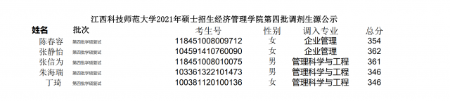 经经济管理学院考察,研究生院审核,本着公平、公正、公开的原则,现将本学院2021年硕士研究生第四批申请学术型硕士调剂考生名单进行公示。详情参见下方文件。