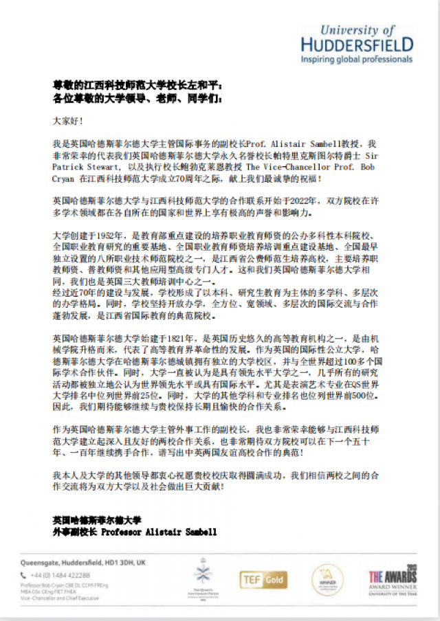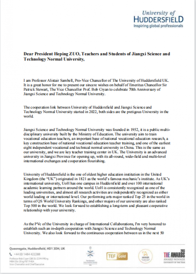 七秩芳华,蕴积涵育。值此70周年校庆盛典之际,经济管理学院首批合作学校——哈德斯菲尔德大学正式来函向我校发来祝福,对学校70周年校庆表示热烈祝贺和真诚祝愿。