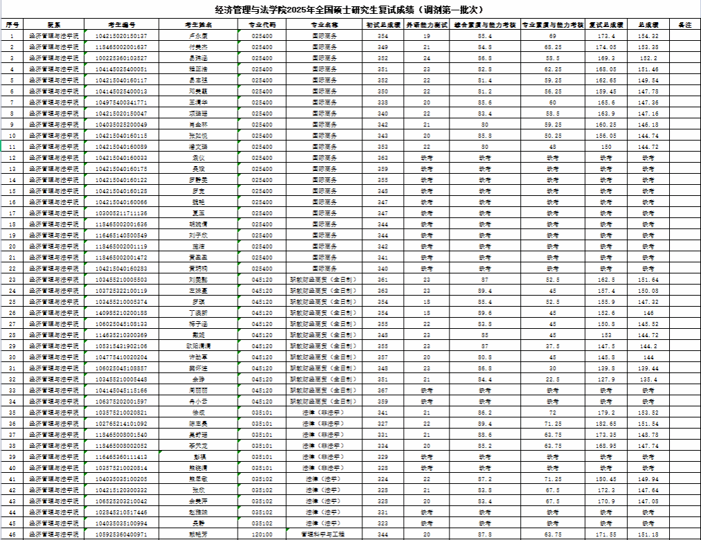 15VIP太阳集团2025年全国硕士研究生复试成绩(调剂第一批次)