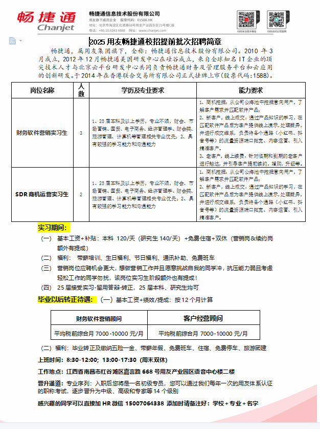 招聘岗位:财务软件营销实习生、SDR商机运营实习生