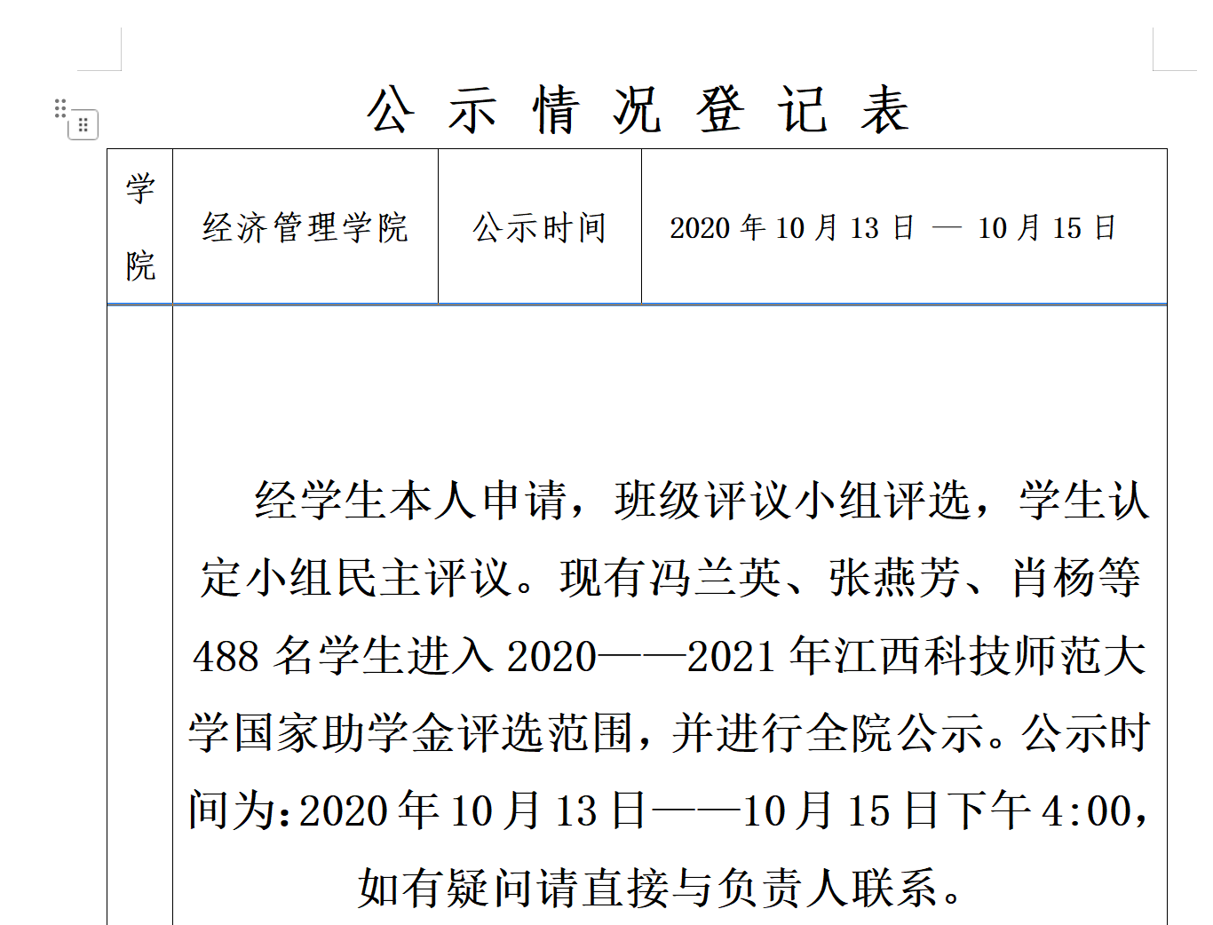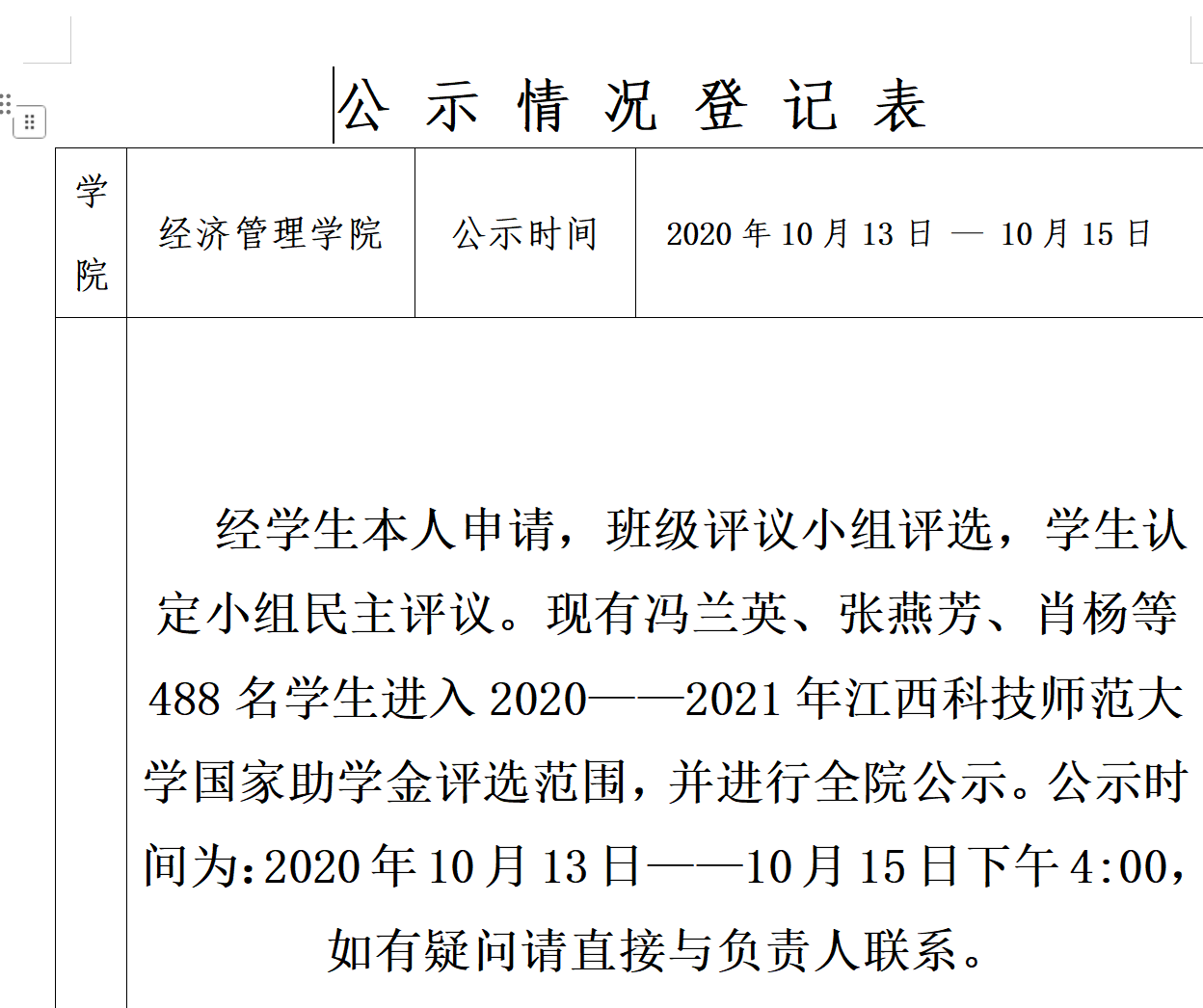 经学生本人申请,班级评议小组评选,学生认定小组民主评议。现有冯兰英、张燕芳、肖杨等488名学生进入2020——2021年江西科技...