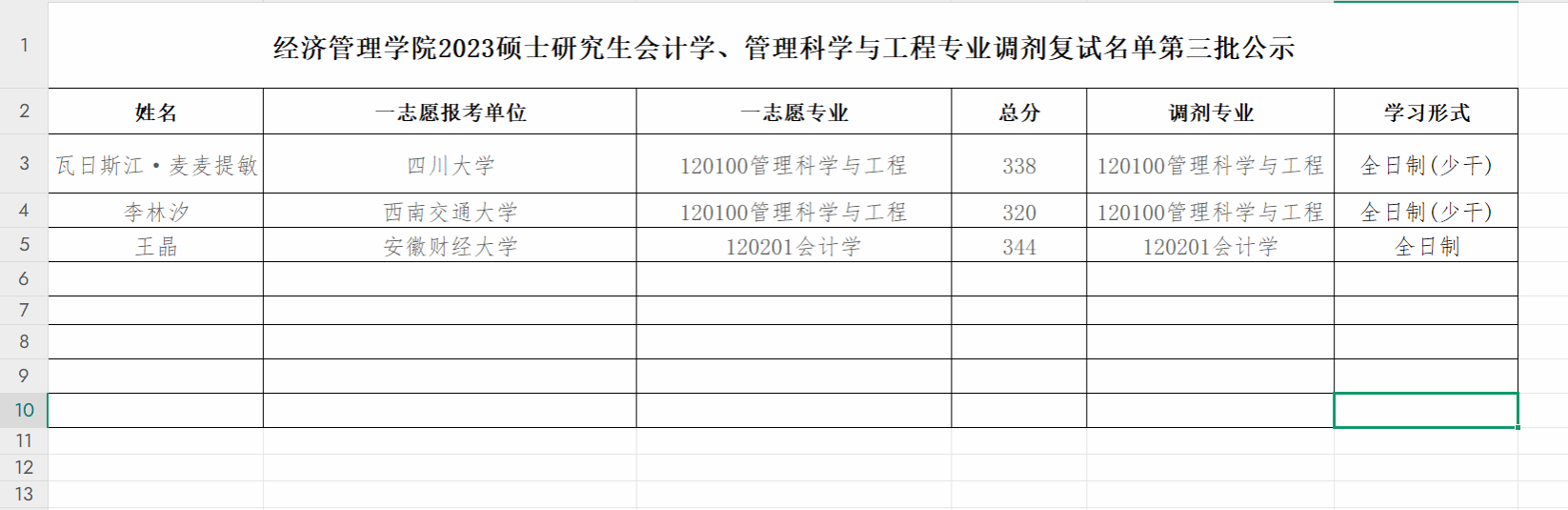 经济管理学院2023硕士研究生会计学、管理科学与工程专业调剂复试名单第三批公示.xlsx
