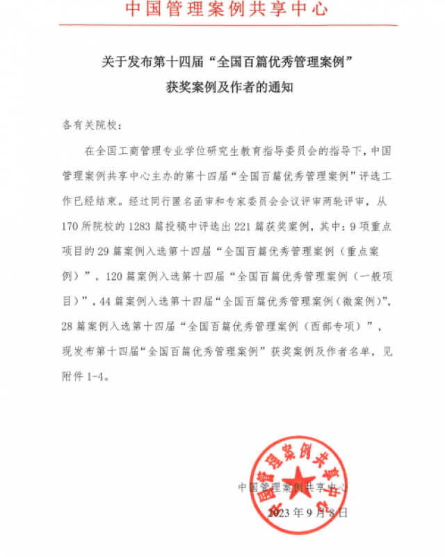 近日,在全国工商管理专业学位研究生教育指导委员会指导下,中国管理案例共享中心承办的第十四届“全国百篇优秀管理案例”公...
