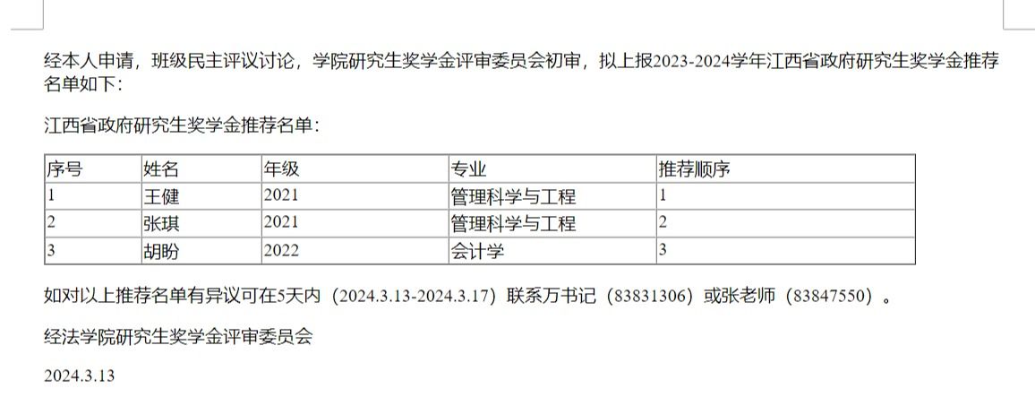 经本人申请,班级民主评议讨论,学院研究生奖学金评审委员会初审,拟上报2023-2024学年江西省政府研究生奖学金推荐名单如下:...